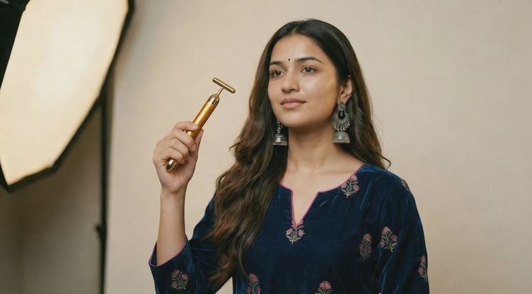 - T-Shaped 24K Gold Head gently vibrates to massage facial muscles & boost circulation.
